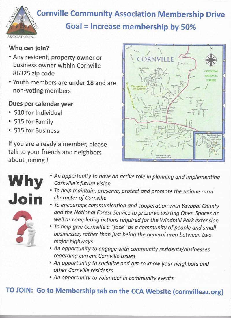 Any person who is at least eighteen years of age and is a resident, property owner, or business owner with a physical address within the Cornville 86325 postal zip code area, an unincorporated area of Yavapai County in the State of Arizona, is qualified to be a member of the community association.